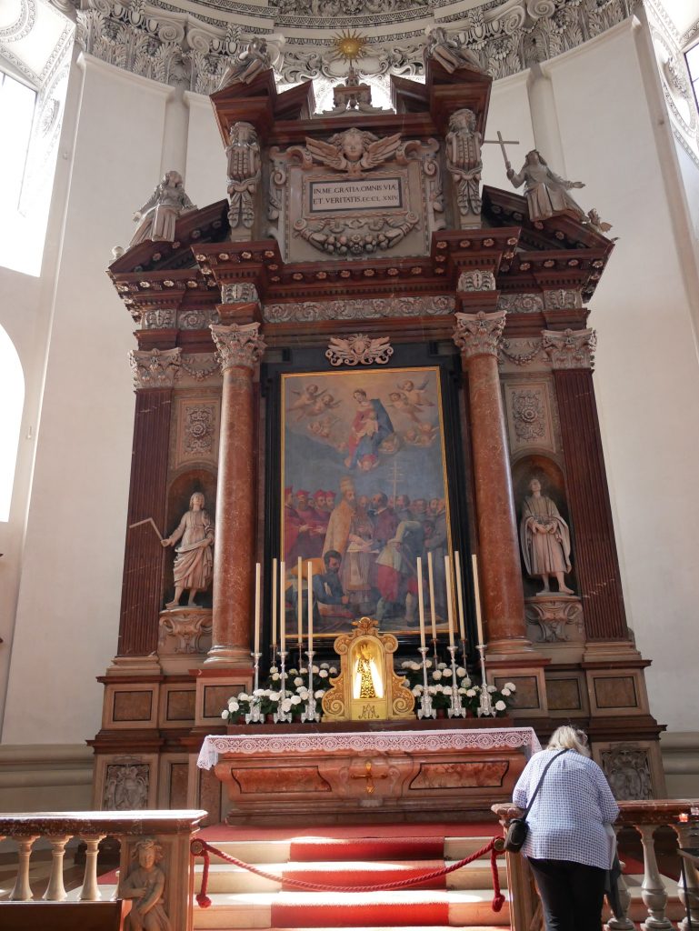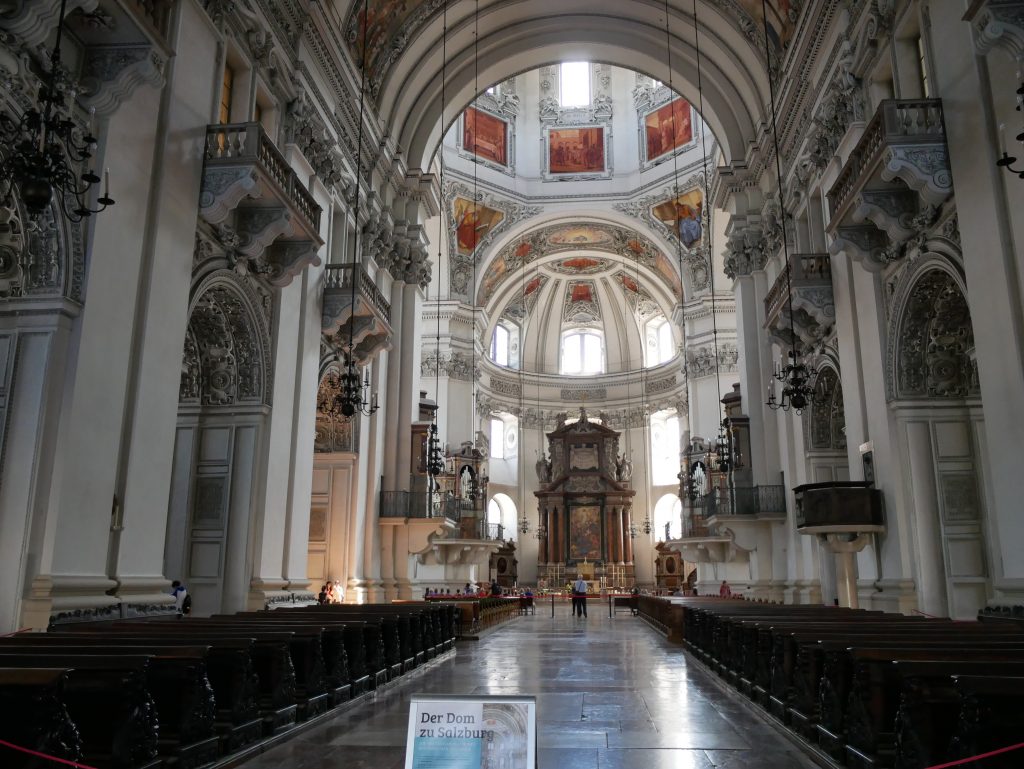 Der erste Kathedralbau enstand 767 und wurde zweimal durch einen Brand zerstört. Der jetzige Dom wurde 1628 geweiht, 1944 durch eine Fliegerbombe teilweise zerstört und 1959 schließlich in voller Pracht wieder geweiht.Mozart wurde hier getauft und war Hoforganist und Konzertmeister.