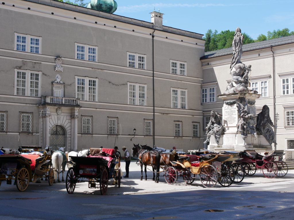 Draußen auf dem Platz  stehen die Kutschen  für die Touristen bereit.