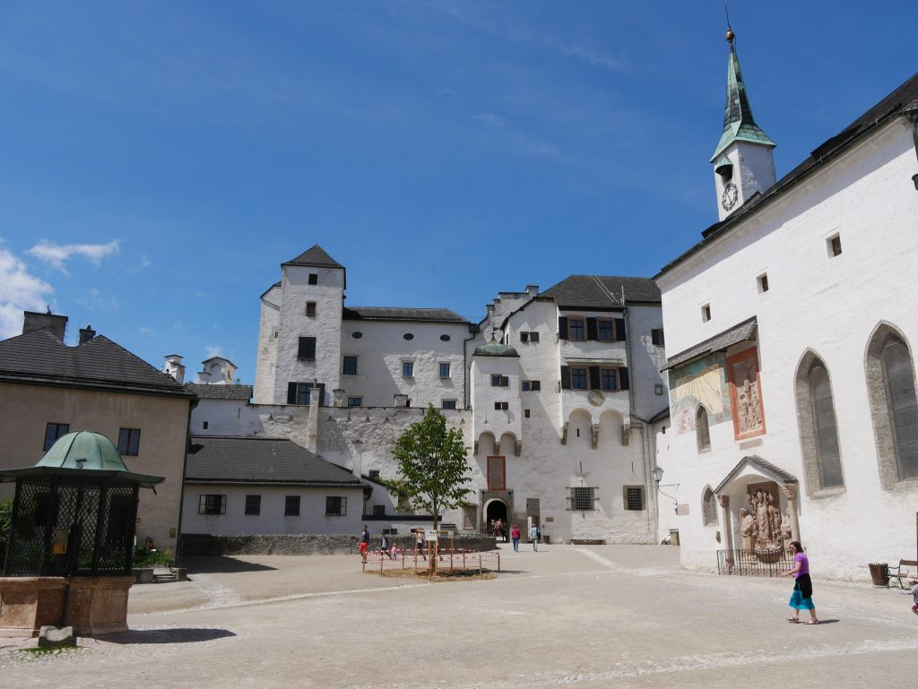 Blick von oben über SalzburgDie Burg liegt auf dem Festungsberg, wurde früher als Kaserne genutzt. Sie reicht bis ins 11. Jahrhundert zurück und ist eine der größten besterhaltenen Burgen Europas.