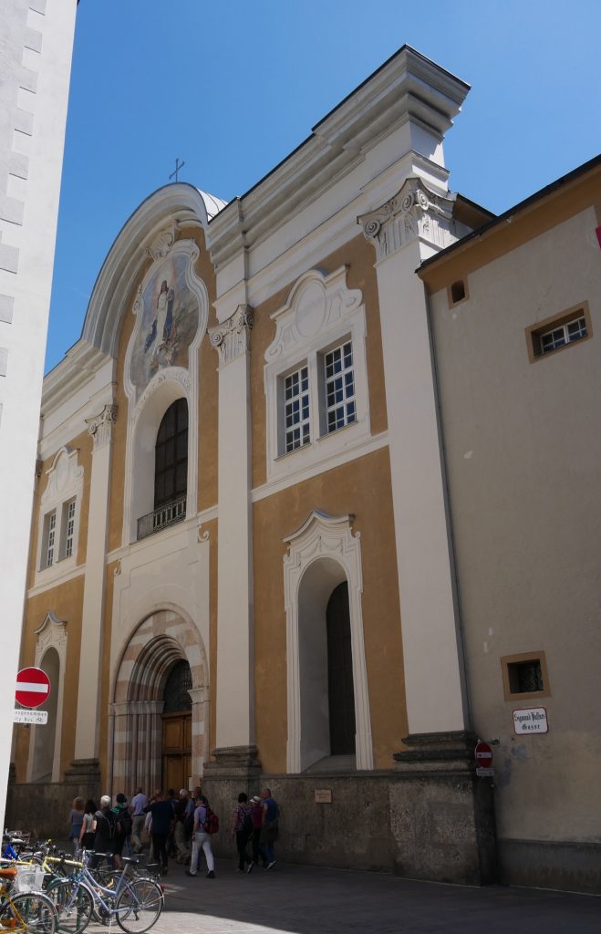 Mit einer hübschen Orgel.Als nächstes gehts zur Franziskanerkirche.  Sie ist eine der ältesten Kirchen in Salzburg. Bis 1139 gehört sie zum Benediktinermönchs-Stift St. Peter, zwischen 1130 und 1583 war sie dann Klosterkirche der Petersfrauen der Benediktinerinnen, nach 1189 war sie bis 1628 gleichzeitig Pfarrkirche der Stadt. 1635 wurde schließlich der Dom zur neuen Pfarrkirche. 1592 wird die Kirche Klosterkirche der Franziskaner.