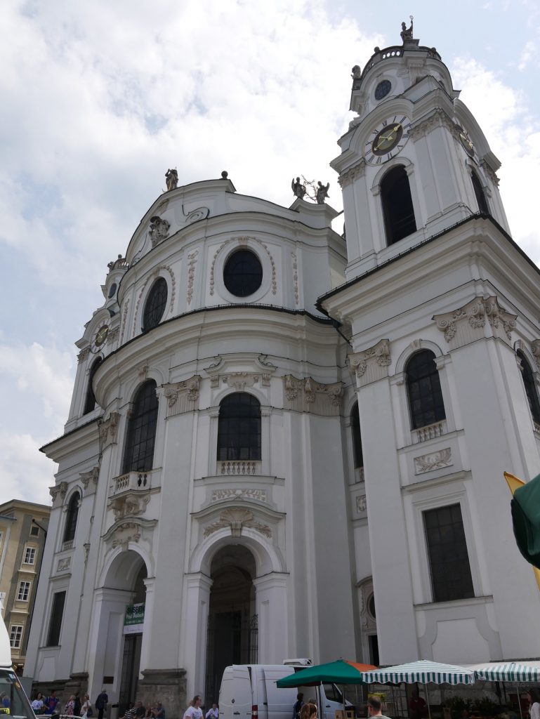 Weiter geht es zur Kollegienkirche. Sie ist die Kirche der Universität Salzburgs. 1707 geweiht, zur Zeit Napoleons militärisches Heulager. Nach Auflösung der Universität, in der Zeit der Monarchie,  Garnisionskirche. 1922 erstmals Spielstätte der Salzburger Festspiele. Seit 1964 wieder Universitätskirche.