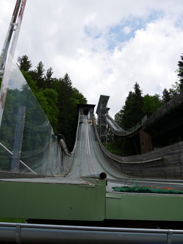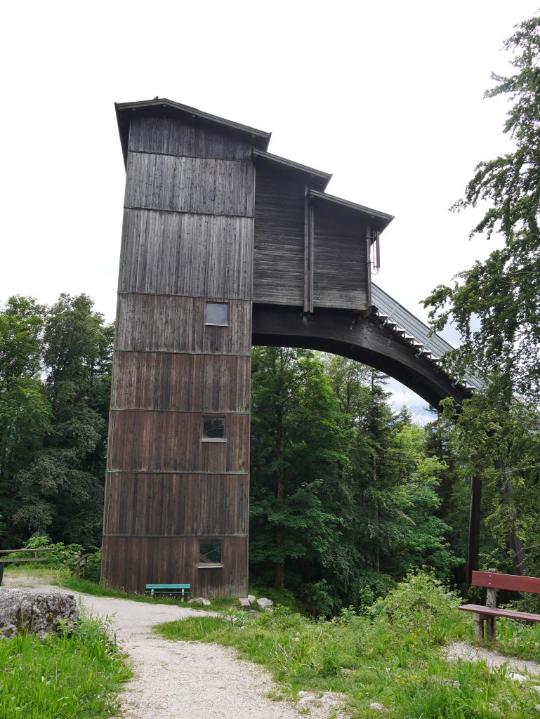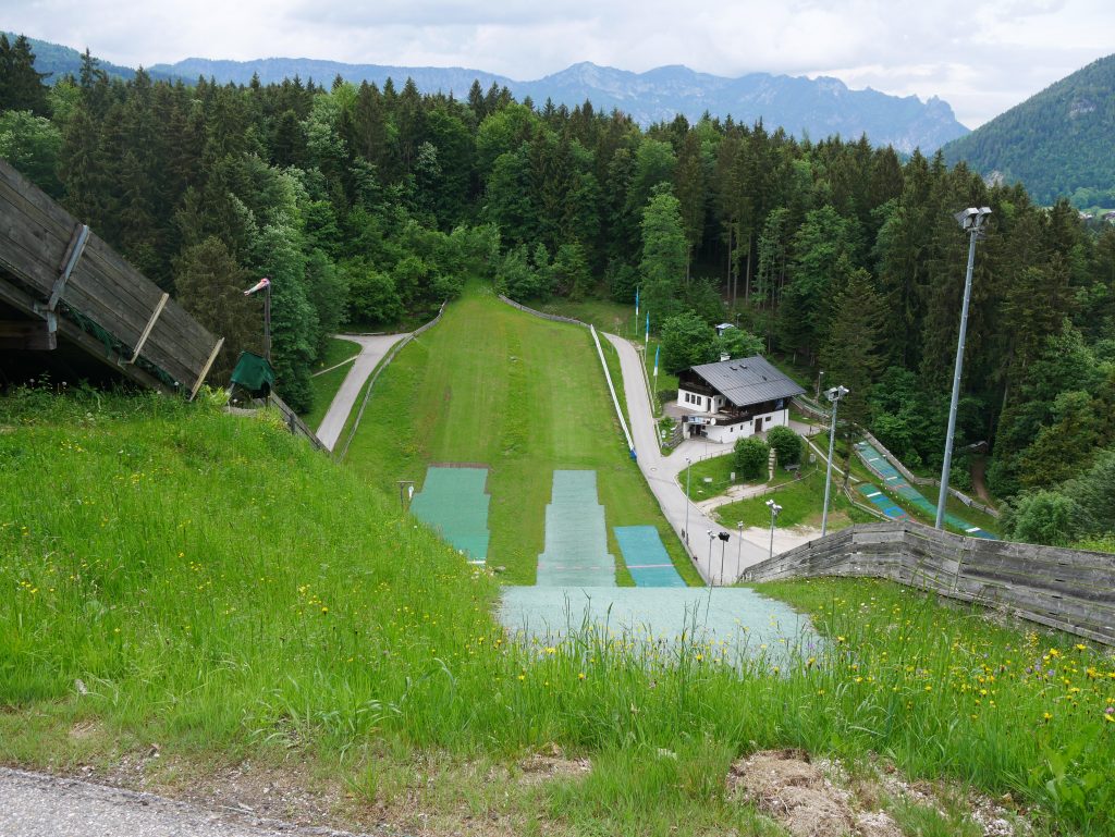 Wir machen es uns auf unserem Balkon gemütlich und genießen ein paar Kekse und Mama ihren Kaffee.  Ich mache mich dann nochmal auf zu einen kleinen Spaziergang zur Kälbersteinschanze. Die Anlage ist Bestandteil des Bundesleistungszentrum Berchtesgaden und seit 2000 macht regelmäßig der Sommer Grand Prix der Nordischen Kombination dort Station.