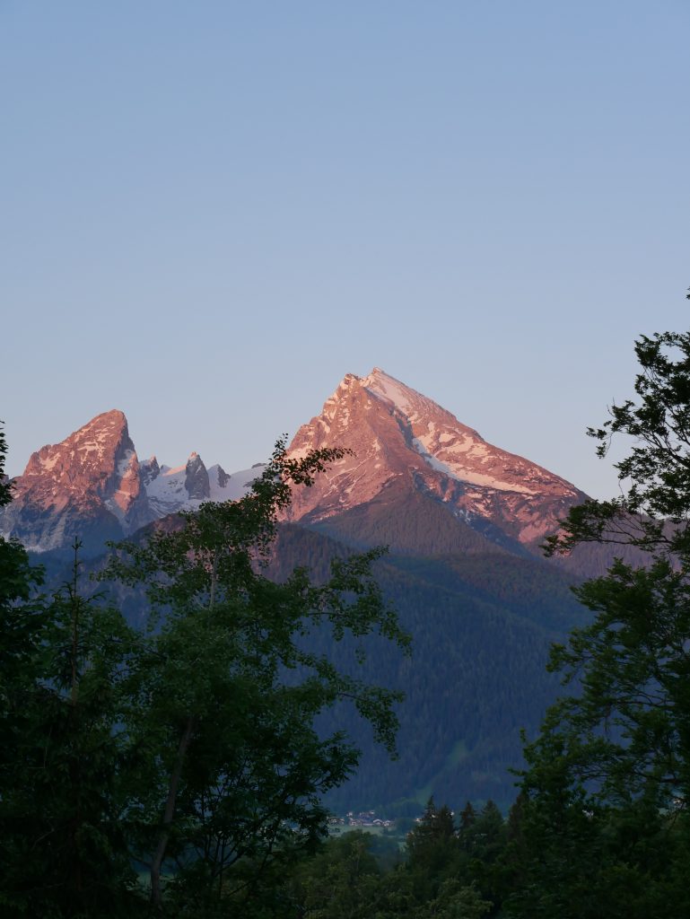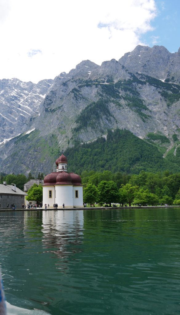Wache früh am Morgen um 5 Uhr irgendwas auf und werde mit diesem Anblick belohnt. Kann von meinem Bett direkt aus der Balkontür sehen und das Bild lässt mich tatsächlich kurz aufstehen um dieses Fotos zu machen.Nach dem Frühstück machen wir uns auf zum Königsee. Wie erwartet ist es sehr voll und schon lange Schlangen an der Kasse. Es ist das erste mal in unserem Urlaub das wir vom                          „Massentourismus“ umgeben sind und es fühlt sich nicht gut an. Aber da müssen wir jetzt durch. Man ist hier darauf eingestellt und so dauert es nicht allzu lange und wir sitzen im Schiff auf dem Weg nach St. Bartholomä.Schon seit 1913 fahren hier nur Elektroboote. Man darf nur mit gemieteten Ruderbooten den See befahren damit die Anzahl begrenzt ist. Privat angeln ist verboten, darf nur ein Besitzer an den dieses Recht verpachtet wurde.