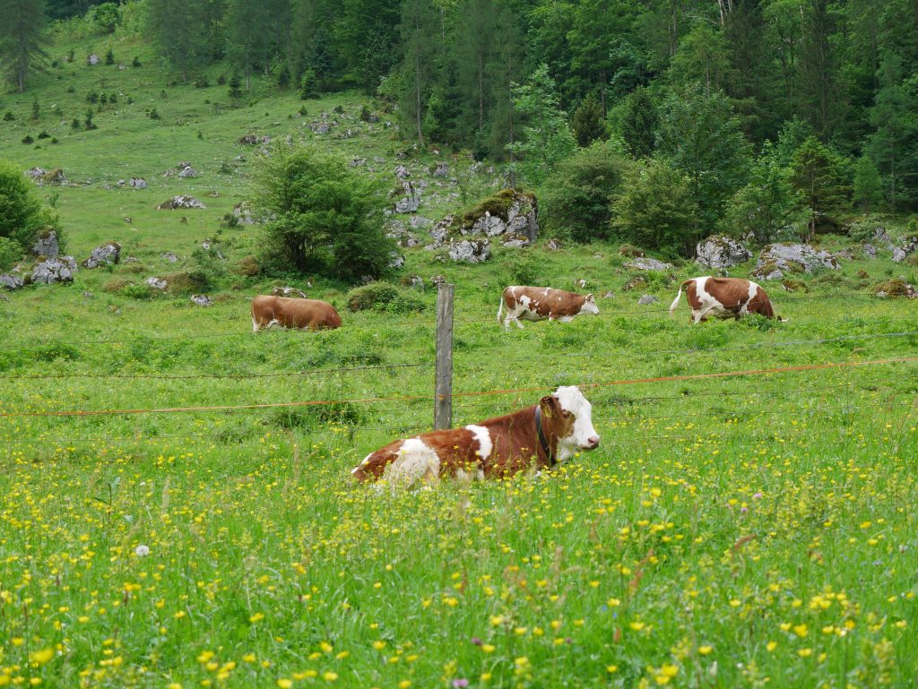Wir machen uns auf zu einer Alm für eine Brotzeit. Vorbei an Kühen und blühenden Wiesen. Richtig idyllisch!