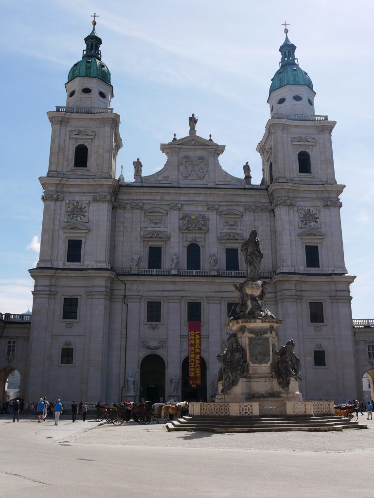 Der erste Kathedralbau enstand 767 und wurde zweimal durch einen Brand zerstört. Der jetzige Dom wurde 1628 geweiht, 1944 durch eine Fliegerbombe teilweise zerstört und 1959 schließlich in voller Pracht wieder geweiht.Mozart wurde hier getauft und war Hoforganist und Konzertmeister.