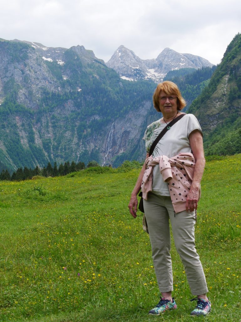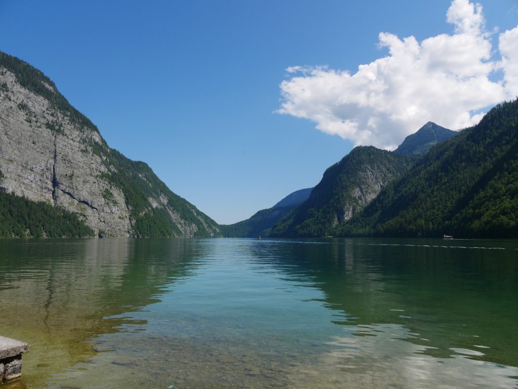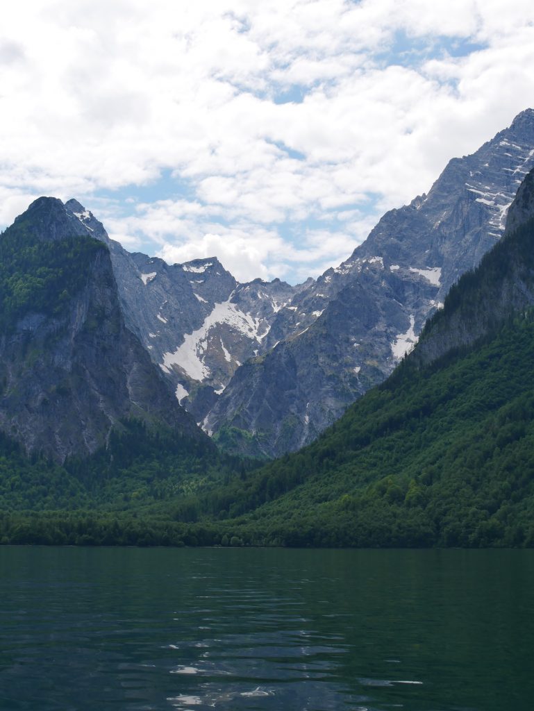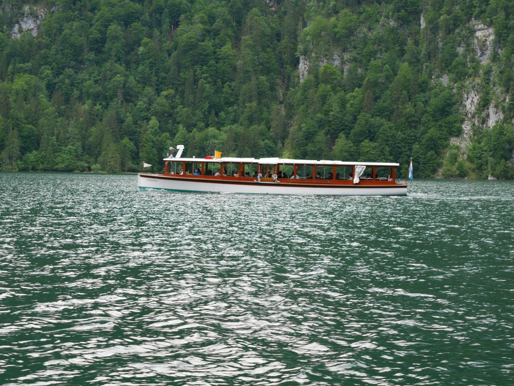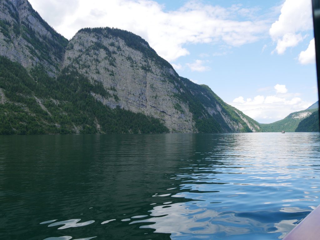 Auf der Fahrt lernen wir allerhand über den See und die Umgebung. Er ist ziemlich kalt, im Hochsommer um die 18 Grad. In 30 Meter Tiefe hat er konstant vier Grad. An seiner tiefsten Stelle ist er 192 Meter tief. Er ist acht Kilometer lang und an seiner breitesten Stelle misst er 1250 Meter.Eingerahmt auf der einen Seite von Herrn und Frau Watzmann mit ihren sieben Kindern. Im Süden vom steinernen Meer, zugleich Grenze zu Österreich.