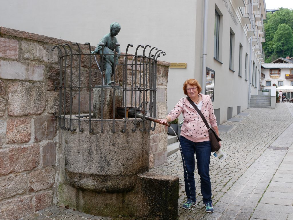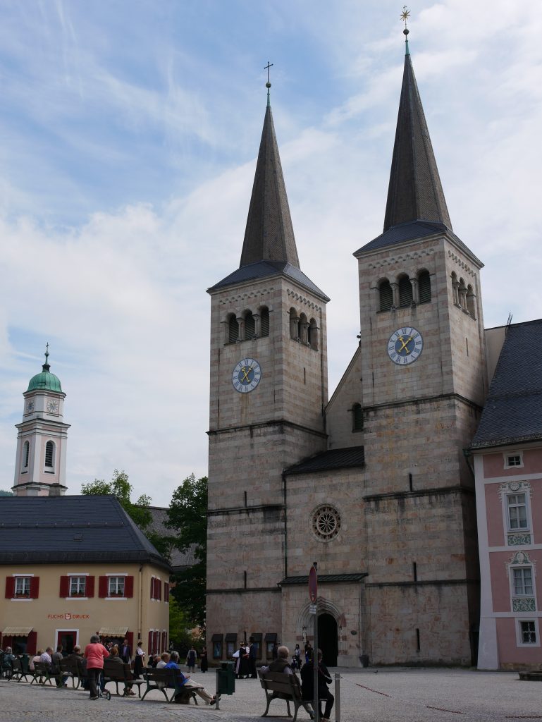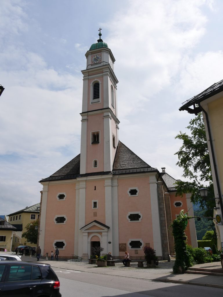 Unsere Pension liegt etwas über Berchtesgaden und man hat einen traumhaften Ausblick auf den Watzmann. Er ist nach der Zugspitze der zweithöchste Berg Deutschlands. Und so sieht die Pension aus, wir haben ein großes Schlafzimmer, sogar ein Fernsehzimmer und einen großen Balkon. Nur das Badezimmer läßt zu wünschen übrig. Man darf nicht groß oder dick sein!Wir fahren also erstmal hinunter nach Berchtesgaden und besichtigen die Stadt. Es ist Pfingstsonntag und fast alles ist geschlossen. Wir schlendern durch den Ort, es gibt auf alle Fälle genug Kirchen.