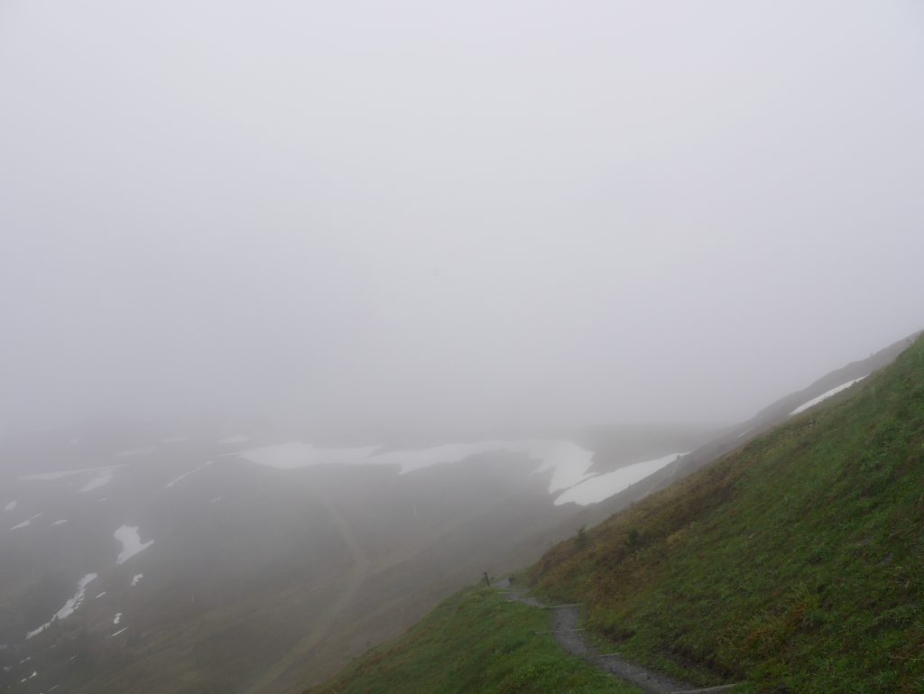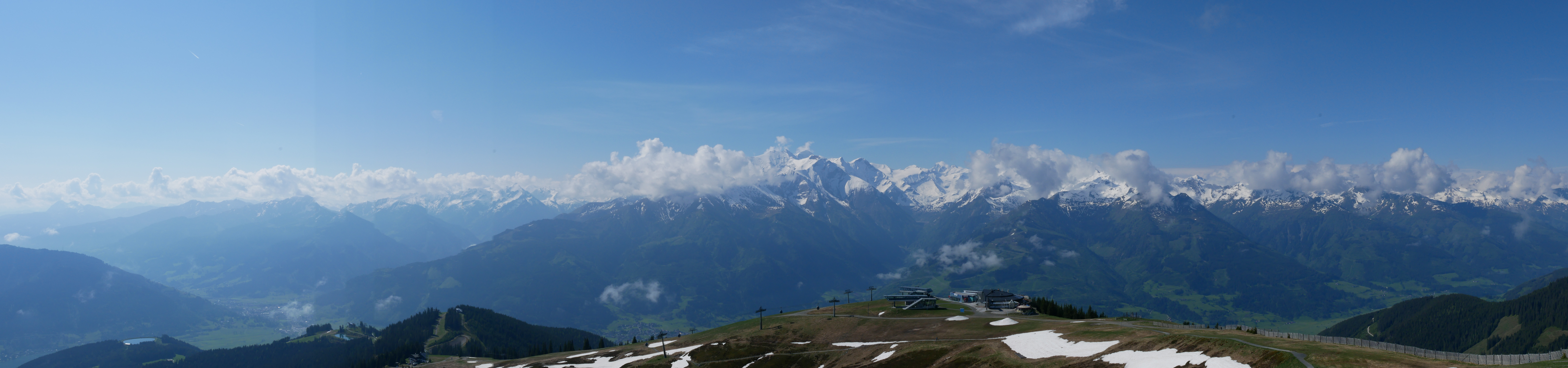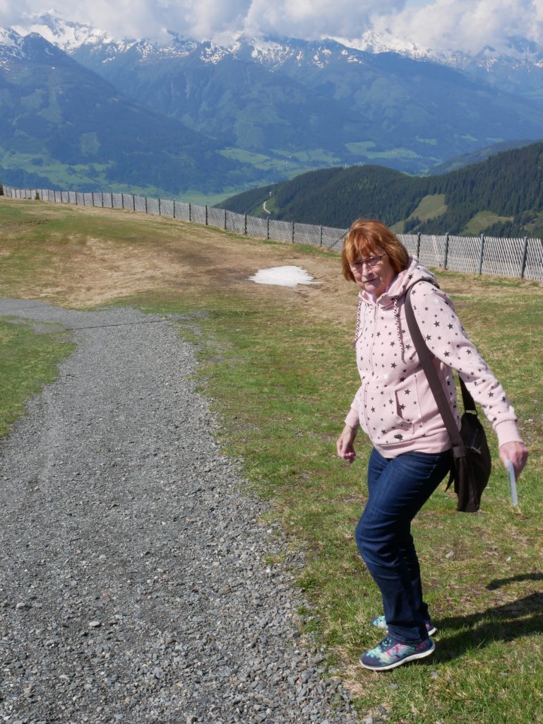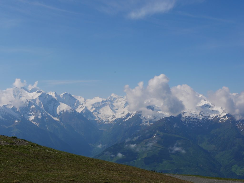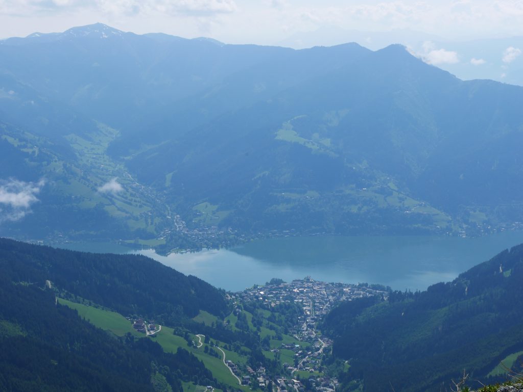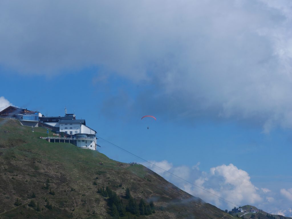 Es gibt zwar noch ein paar Wolken und es ist leicht diesig aber beim letzten Mal konnten wir ja gar nichts sehen. So sind wir natürlich von diesem Ausblick begeistert 🙂Und ich kann zumindest den Großglockner von weitem sehen, nachdem wir die Großglockner Hochalpenstrasse nicht fahren konnten.Und Zell am See im Tal.Wir entscheiden uns ein kleines Stück hinunterzuwandern zur nächsten Gondelbahn.Der Weg ist nicht weitAuf dem Weg hinunter sehen wir den Gleitschirmflieger der mit uns hinaufgefahren ist. Er war sich etwas unsicher wo er springen kann da er das Gebiet nicht kannte. Anscheinend hat er sich schnell entschieden 🙂