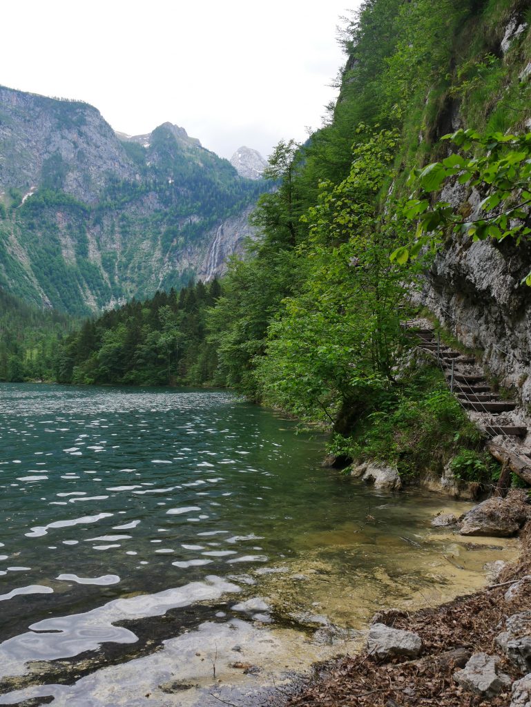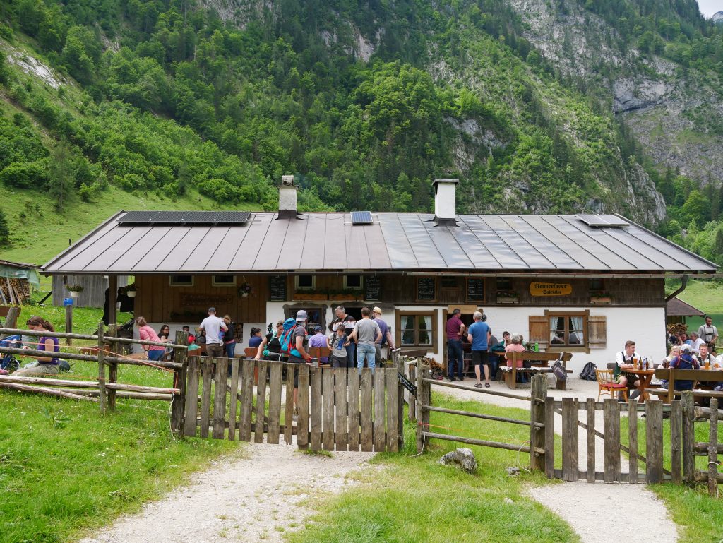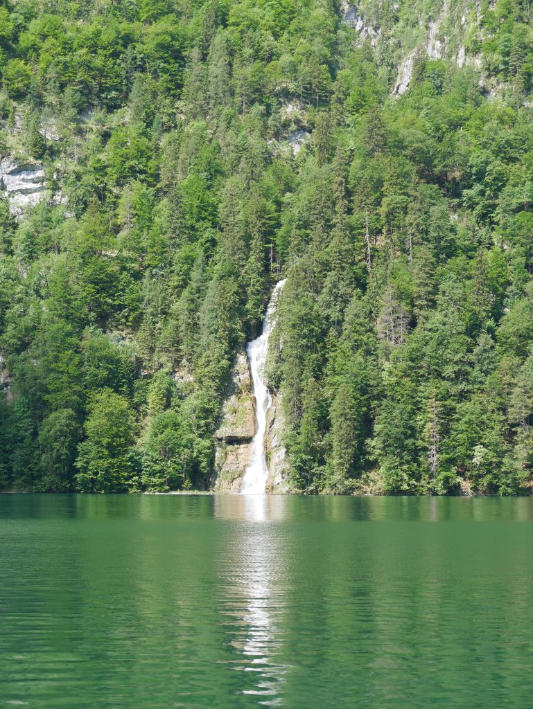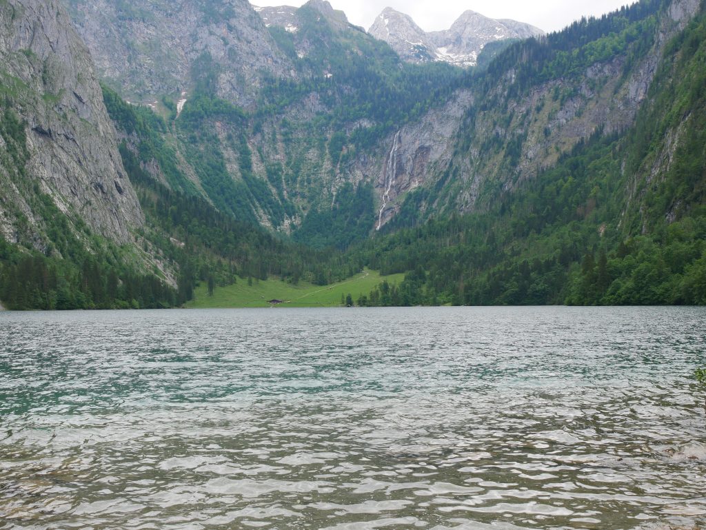 Wir steigen wieder ins Boot, die hier ungefähr alle zehn Minuten an und ablegen, kommen am Schrainbachwasserfall vorbei der den Königsee mit Wasser speist. Ankunft in Salet, der Endhaltestelle. Von dort aus kann man zum Obersee wandern. An dem See kann man an der rechten Seite noch entlang wandern und kommt dann zur Fischunkelalm. Im Hintergrund zu erkennen der Röthbachfall. Er ist mit 470 Metern der höchste Wasserfall Deutschlands.