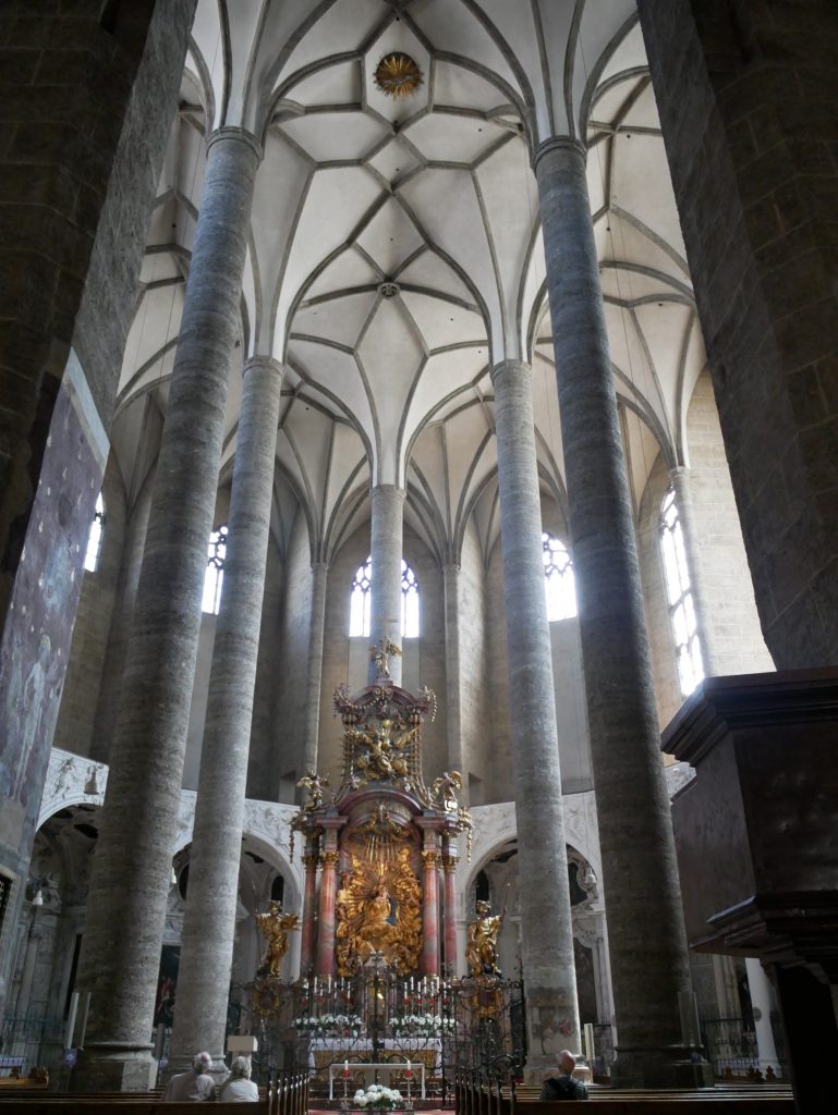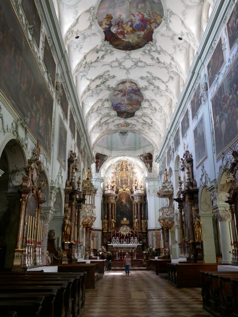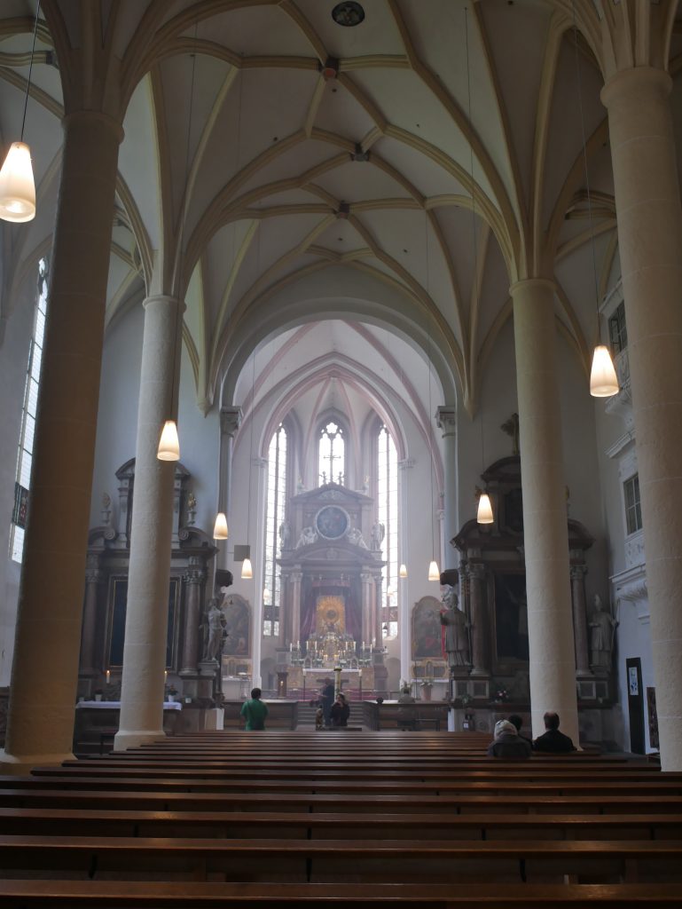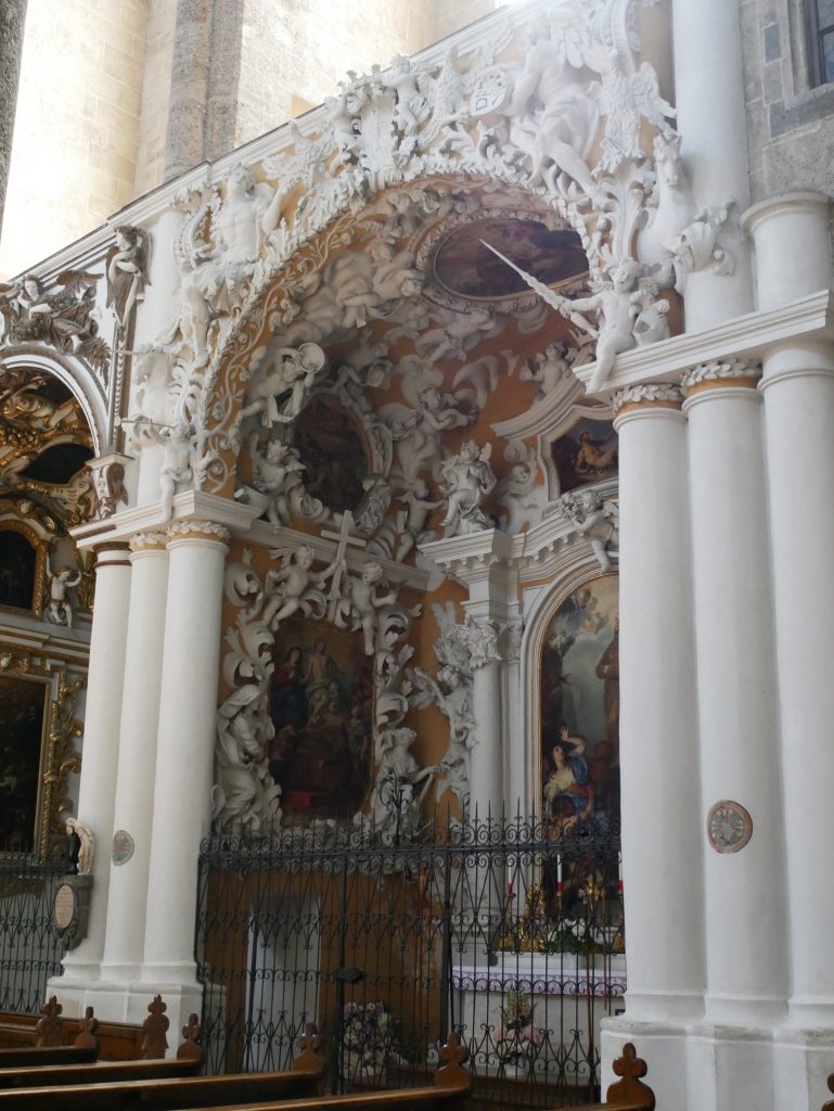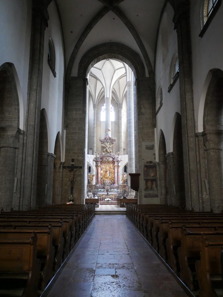 Vorne das dunkle Langhaus, hinten der helle gotische Hallenchor.Rund um den Hochaltar befinden sich acht verschiedene hübsche Chorkapellen.Wir machen uns auf zum Wahrzeichen der Stadt, die Festung Hohensalzburg.