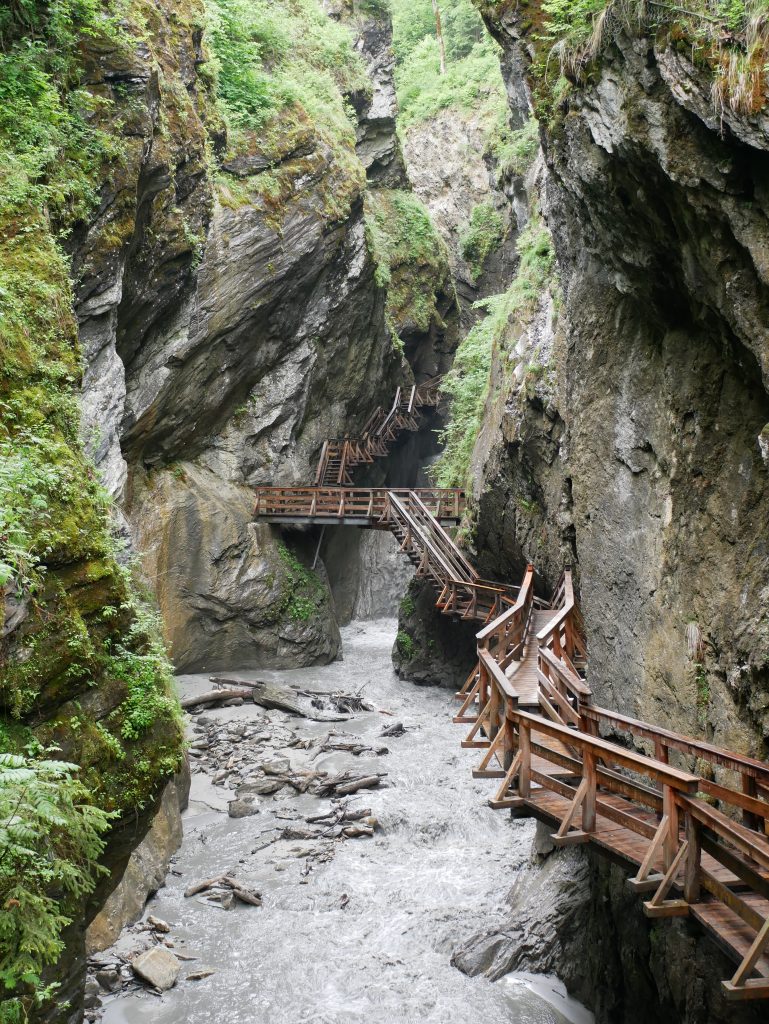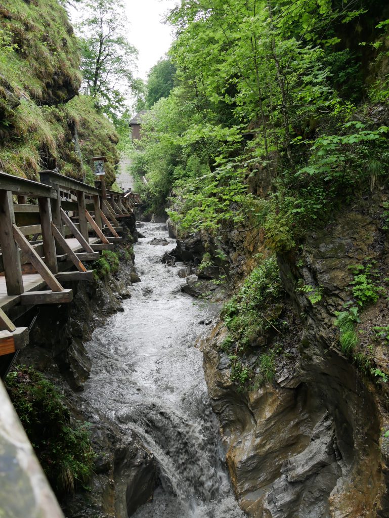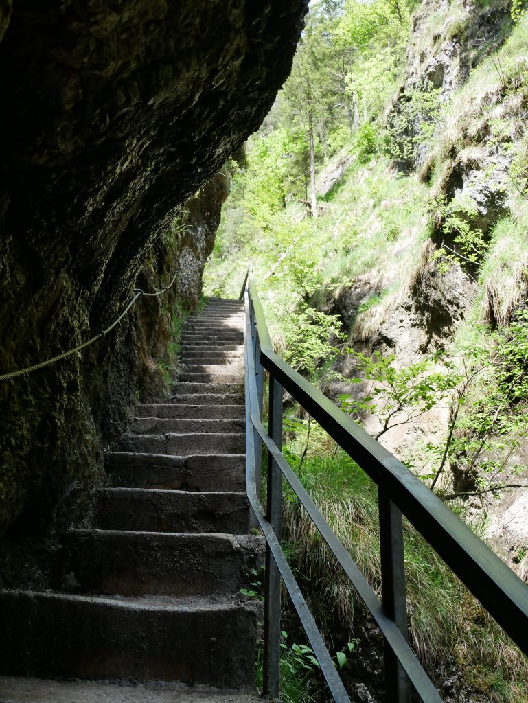 Die Klamm ist drei Kilometer lang und führt über 29 Brücken, einem Tunnel und 320 in den Fels gehauenen Stufen. Und beginnt harmlos.