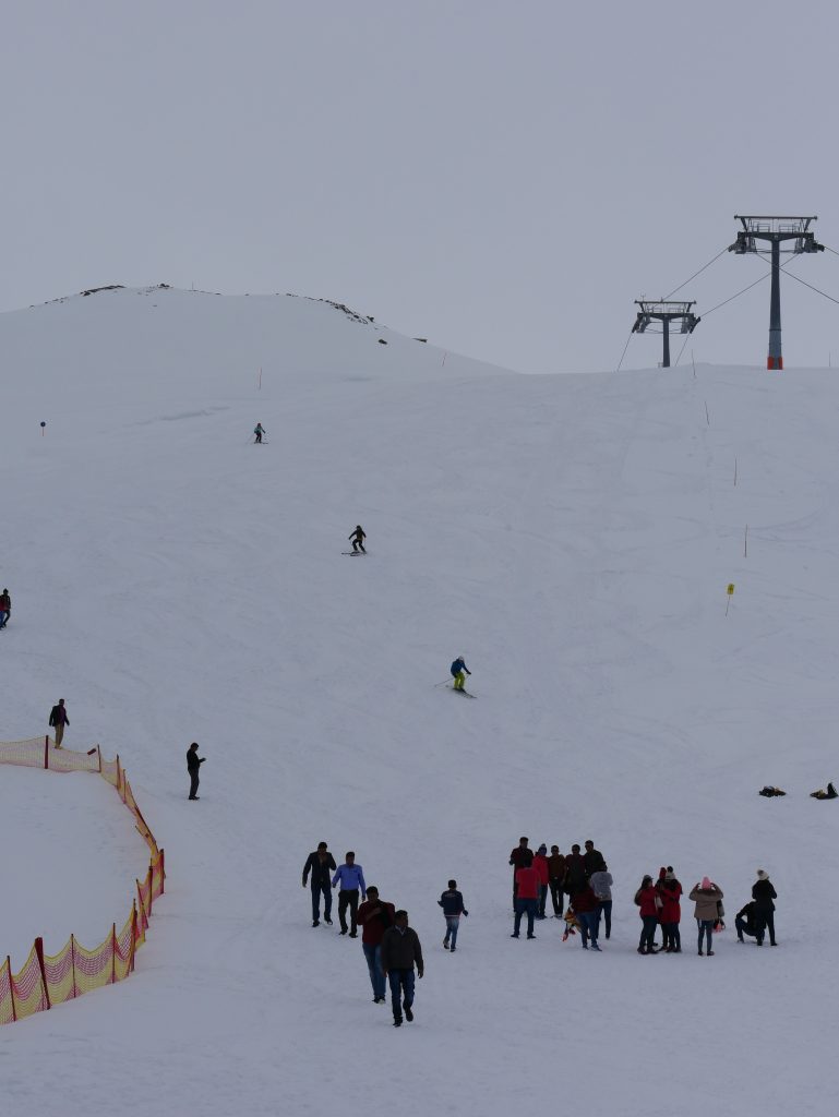 Oben angekommen erwarten uns nur Matsch, Baufahrzeuge und Baulärm. Außerdem kommen uns schon Skifahrer entgegen die wieder hinunter möchten. Wir wagen uns trotzdem in den zweiten Lift, einem Sessellift diesmal.Und erreichen das Alpincenter auf 2450 Meter Höhe.Dort liegt, wie man sieht schöner Schnee. Vor uns angekommen ist eine große Gruppe Inder, die anscheinend noch nie Schnee gesehen haben. Es wird wie wild fotografiert und Schneebälle hin und her geworfen.Um nach ganz oben zu kommen müssten wir noch einmal mit einer Gondelbahn fahren, entscheiden uns aber wieder für den Weg nach unten.Dann fahren wir zur Sigmund-Thun-Klamm, die seit heute geöffnet ist und an der wir schon vorbeigekommen sind.Sie ist nur 320 Meter lang und bis zu 32 Meter tief. Leider wird der über der Klamm liegende Klammsee heute einer Spülung unterzogen. Dadurch ist das Wasser so grau 🙁