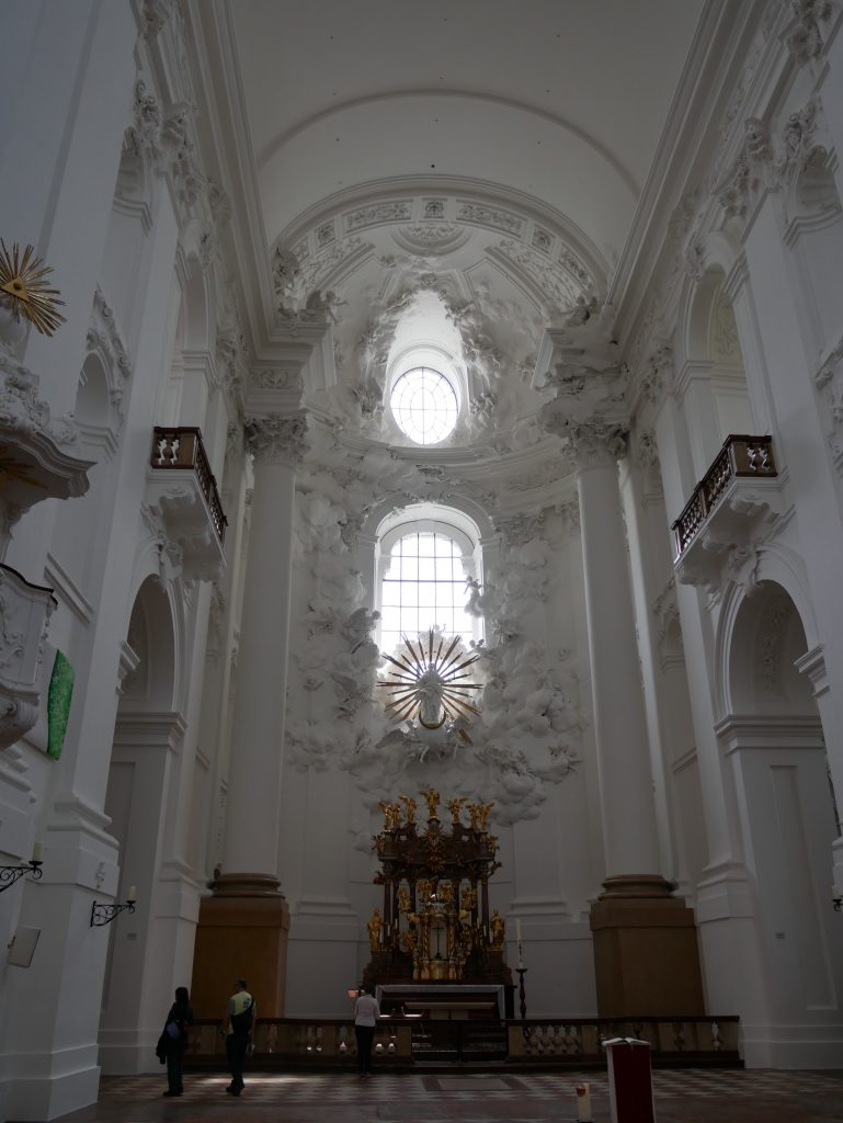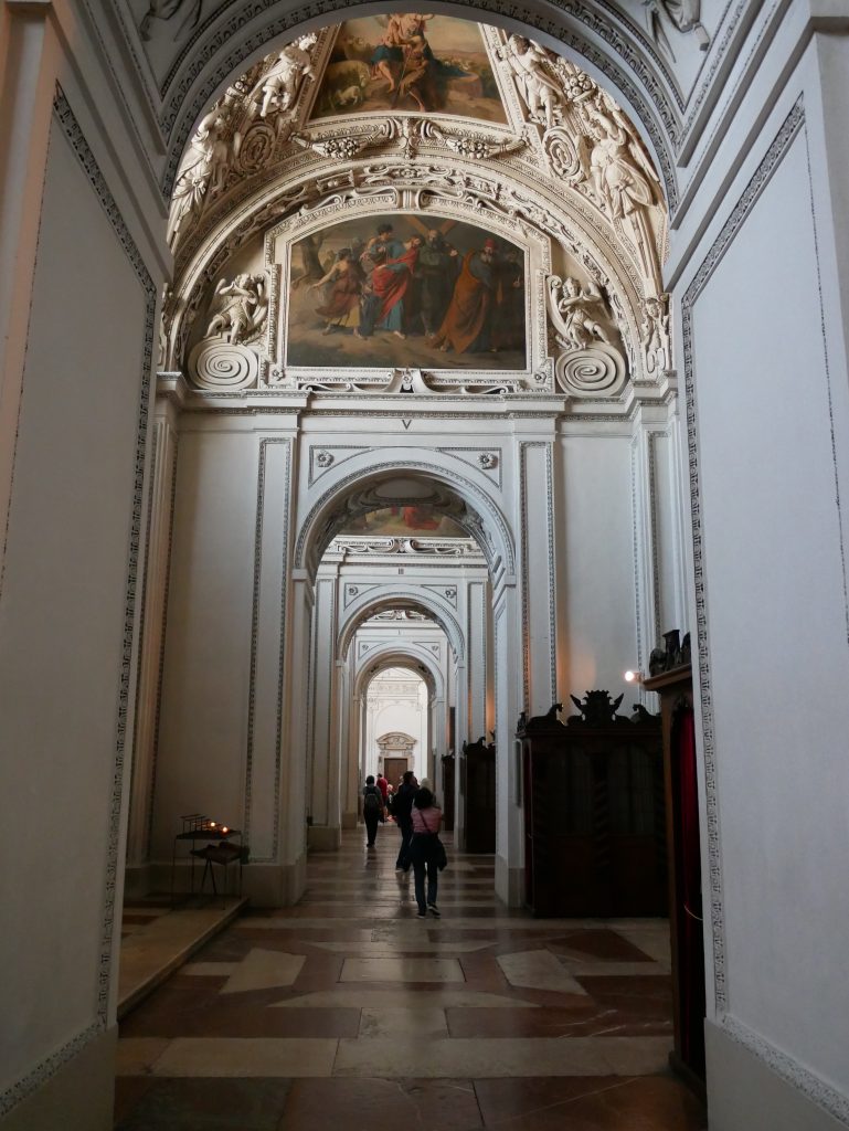 Weiter geht es zur Kollegienkirche. Sie ist die Kirche der Universität Salzburgs. 1707 geweiht, zur Zeit Napoleons militärisches Heulager. Nach Auflösung der Universität, in der Zeit der Monarchie,  Garnisionskirche. 1922 erstmals Spielstätte der Salzburger Festspiele. Seit 1964 wieder Universitätskirche.