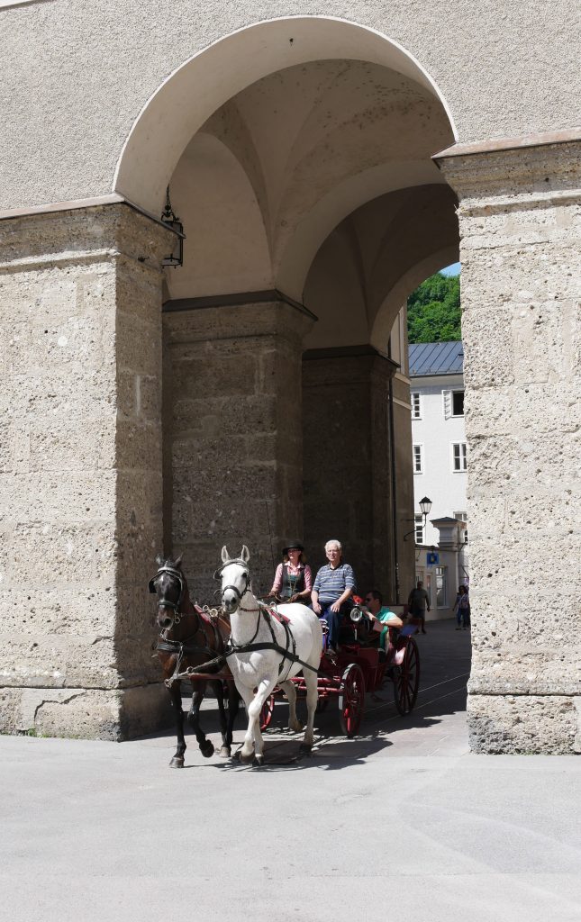 Wir fahren direkt in die Altstadt mit ihren kleinen wunderhübschen Gassen.Ursprünglich hieß die Getreidegasse Trabe-, Trab- oder Trav-Gasse. Der Name stammte vom Wort  „traben“, also „laufen“ ab, bezeichnete aber auch das Traben der Pferde. Mit den Jahren entstand über die Bezeichnungen Tragasse, Traidgasse und Getreidgasse schließlich der heutige Name.Die zierlichen und verspielten Zunftzeichen an den Hausfassaden werden noch heute von der  Traditionsschlosserei Wieber in der Getreidegasse von Hand hergestellt.
