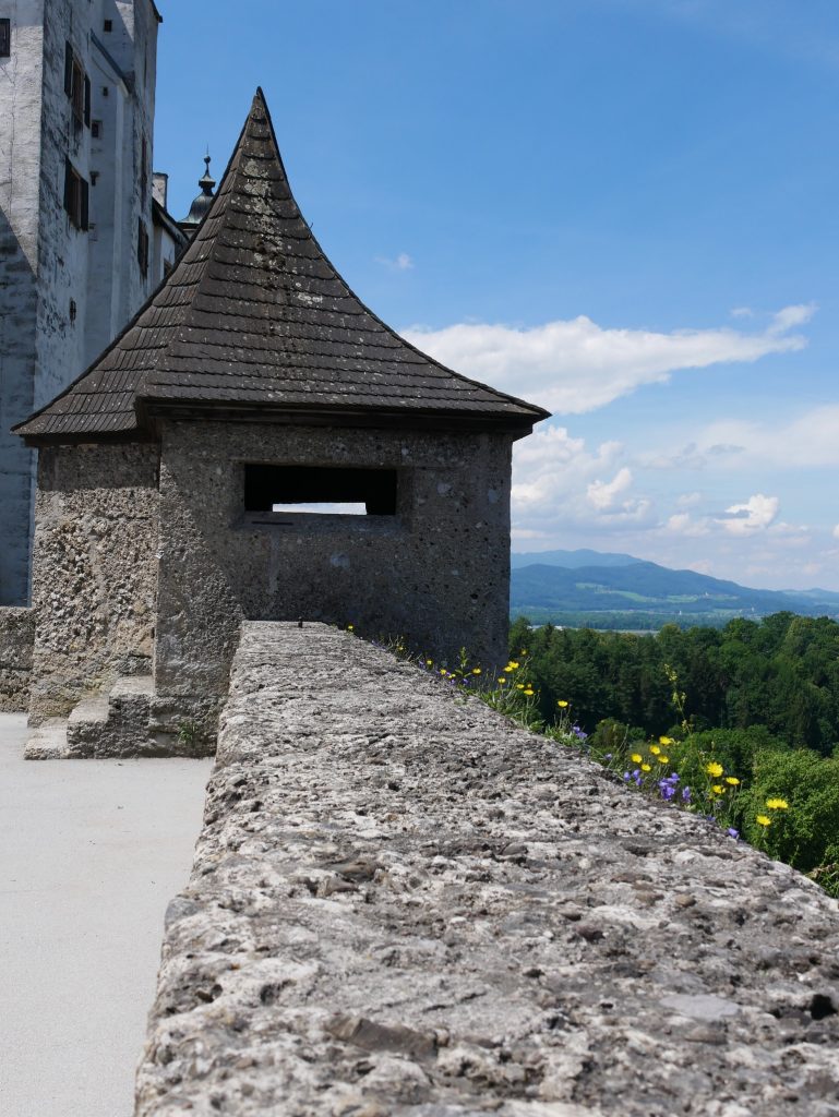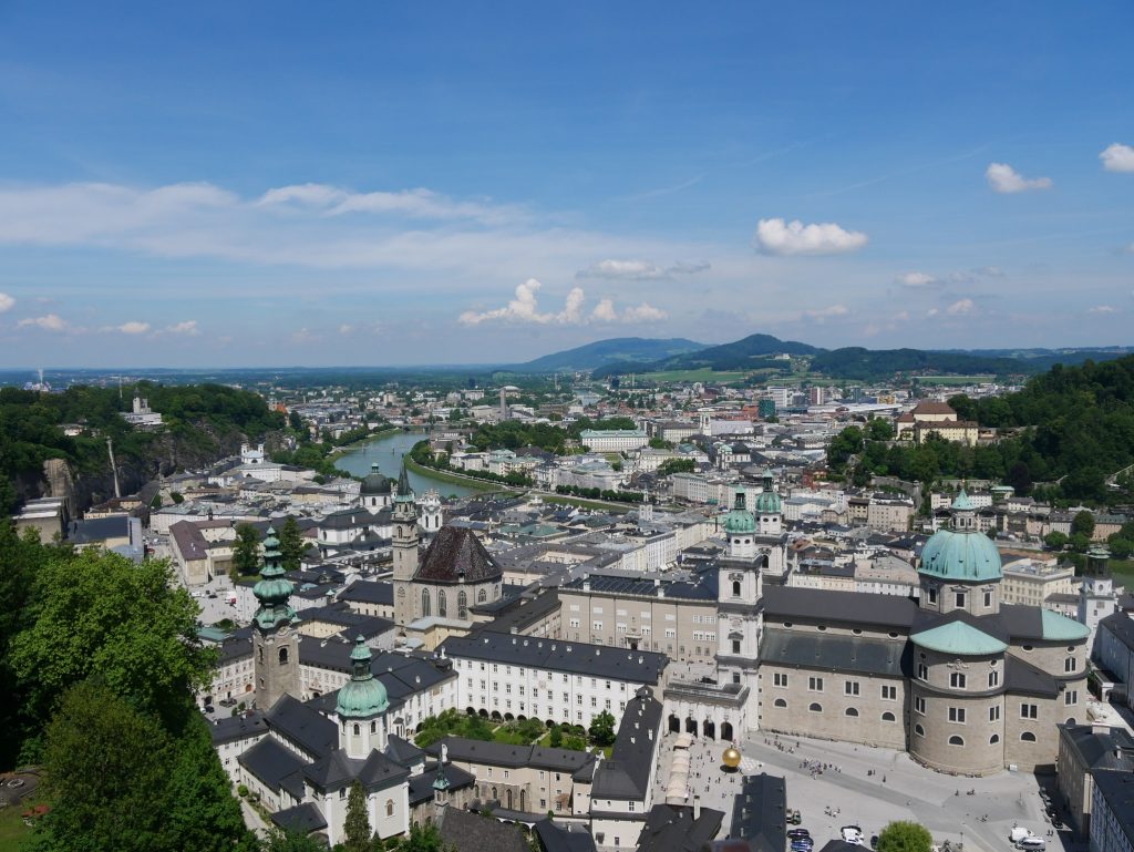 Blick von oben über SalzburgDie Burg liegt auf dem Festungsberg, wurde früher als Kaserne genutzt. Sie reicht bis ins 11. Jahrhundert zurück und ist eine der größten besterhaltenen Burgen Europas.