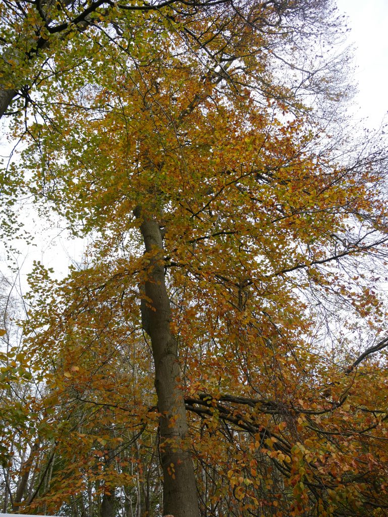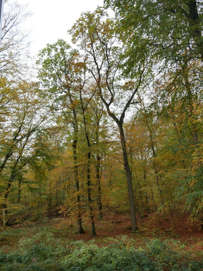 Der Pfad geht stetig bergauf, ist aber mit einer Steigung von nur 6 % gut zu bewältigen und führt durch einen wunderschönen herbstlich Buchenmischwald.