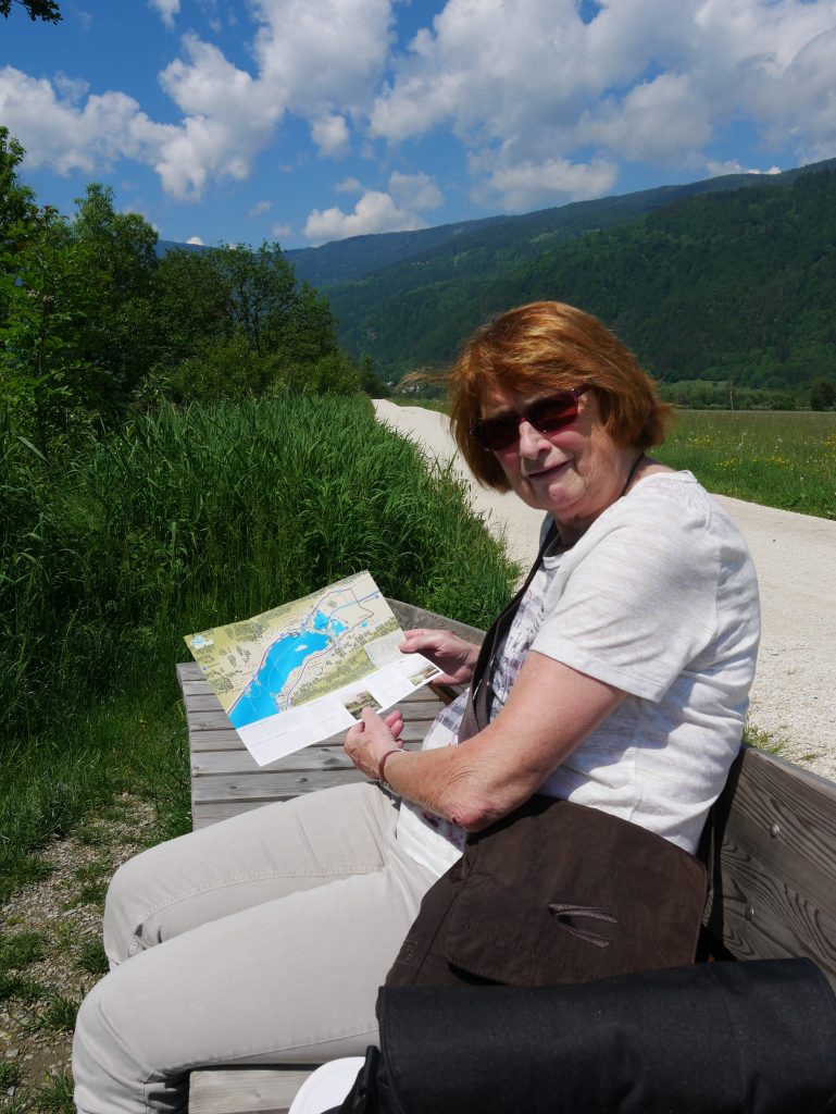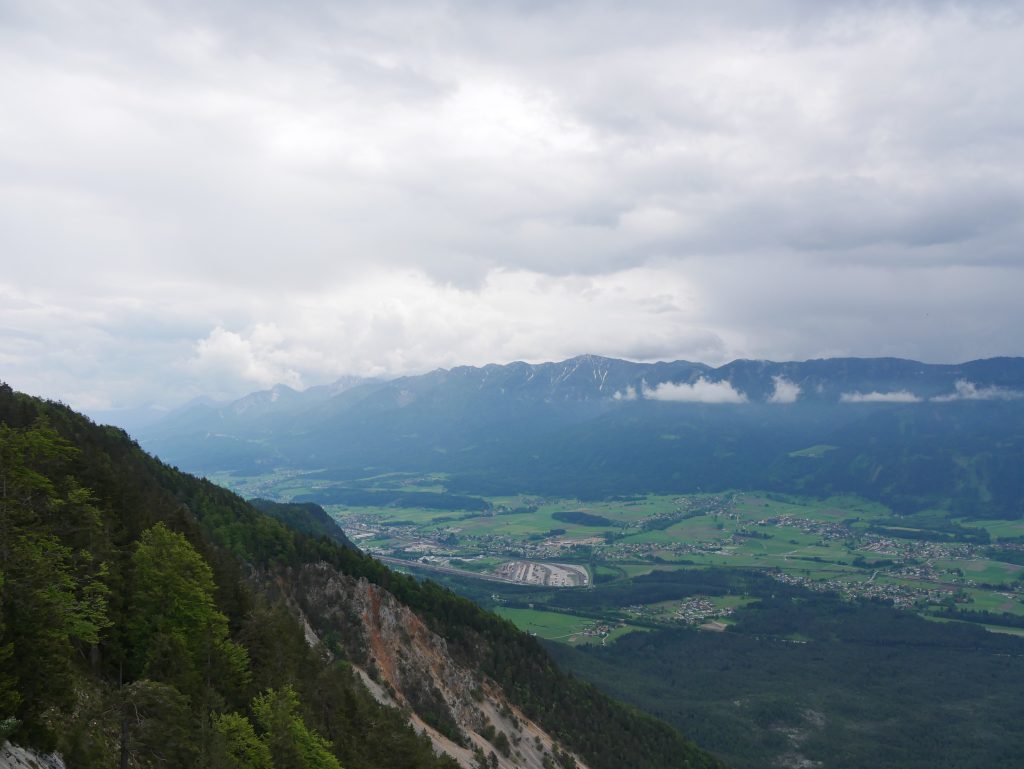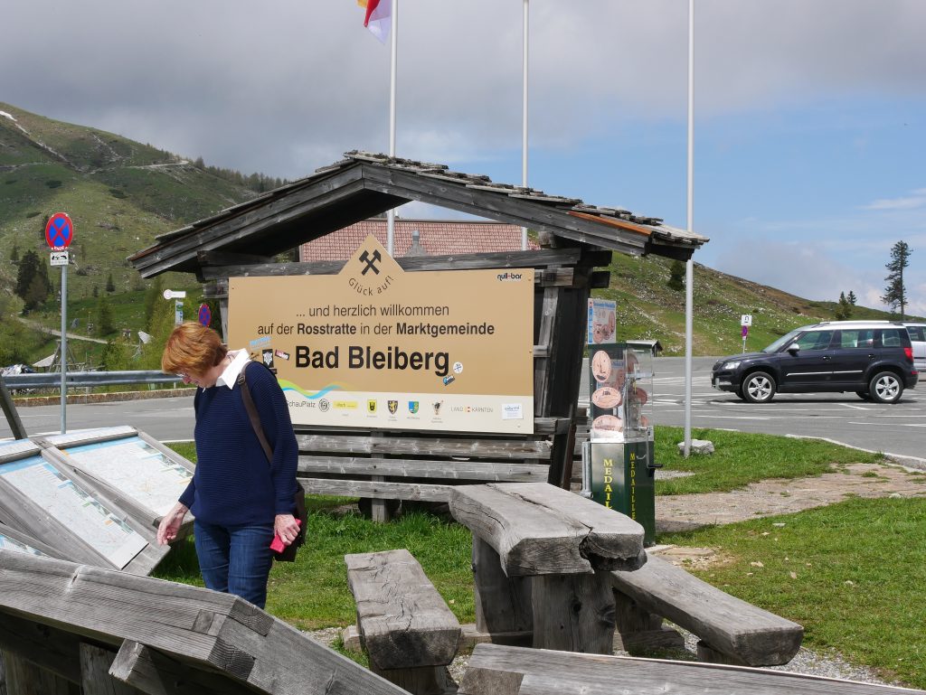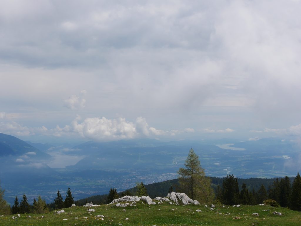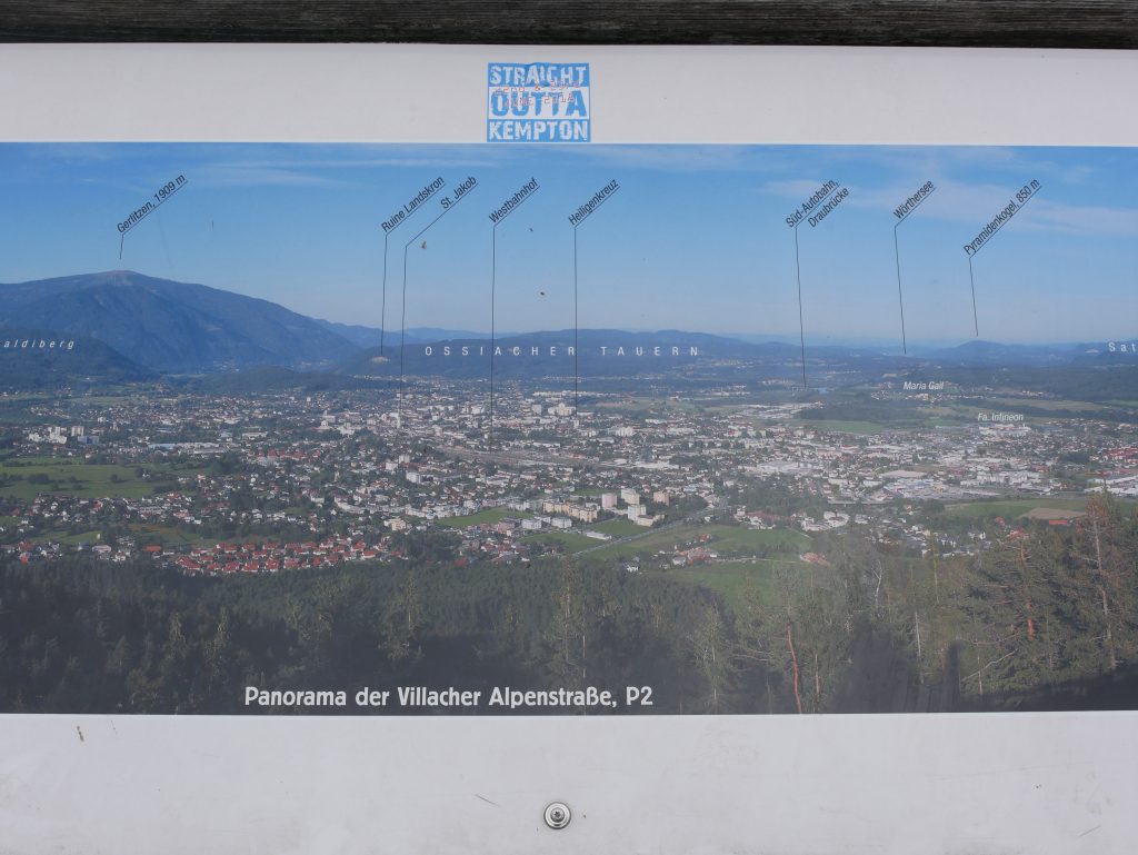 Es geht weiter hinunter auf 862 Meter Höhe. Dort hat man einen schönen Blick auf die Stadt Villach. Netterweise mit Erklärungstafel.