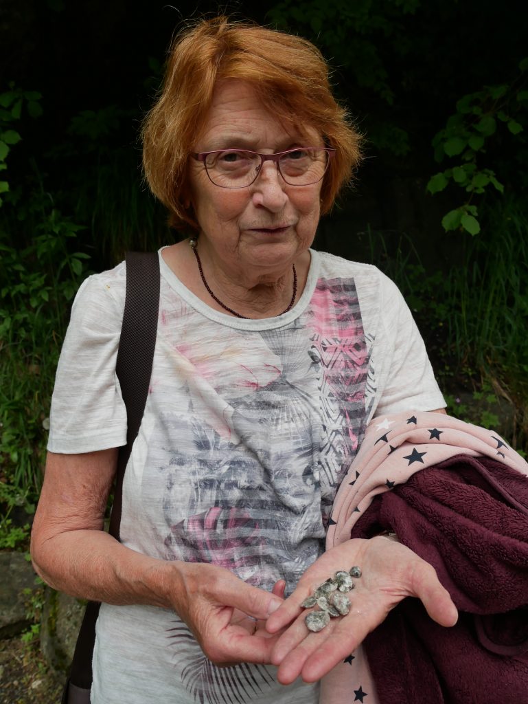 Dort bekommen wir Werkzeug und Schutzbrille und dürfen uns Granatsteine aus dem Fels hauen.