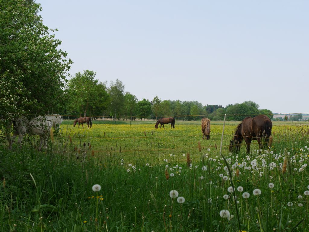 Die Pferde genießen das frische Gras auf der Wiese